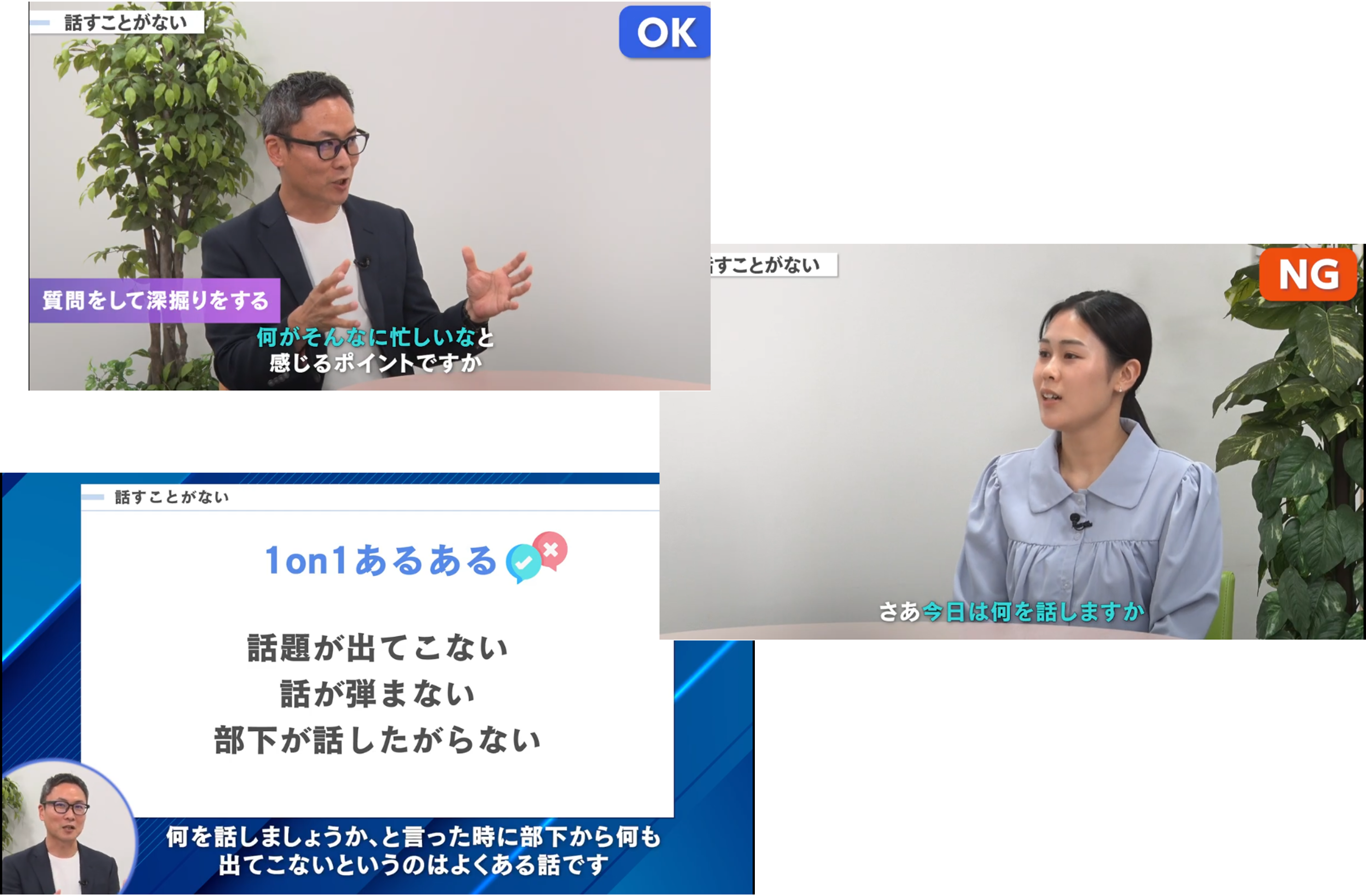 1on1の「あるある」な状況を再現し、解説する章もご用意しております。このパートでは「OKパターン」と「NGパターン」を比較しながら、部下との効果的なコミュニケーションのヒントを学ぶことができます。さらに、「部下からこんなことを言われたら?」という応用編を通じて、どんな状況でも自信を持って対応できる具体的なスキルを習得できます。