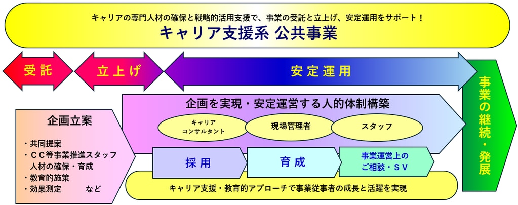 日本マンパワーは、キャリア支援・教育的ノウハウを活用し、自治体・教育庁等が実施するキャリア支援系公共事業において、企画立案からキャリアコンサルタントを中心とした現場管理者・スタッフ等専門人材の確保と育成を行い、事業の受託と立上げ、事業従事者様の成長と活躍、事業の継続・発展に向けた安定運営をサポートいたします。